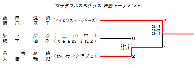 | 女子ダブルスBクラス Cブロック | 藤重来実 藤田心結 | 坂本 塩谷 | 坂下 坂下 | 順位 |