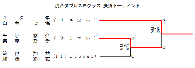 | 千谷 悠介 栗原 乃愛 (ラミエル) | ○ -X -X | ○ 21-13 21- 8 | ○ 13-21 21-17 22-20 | 1 |