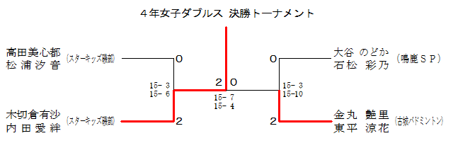 | 4年女子ダブルス Cブロック | 奥山 友廣 | 高田美心都 松浦汐音 | 薗田 田中 | 順位 |