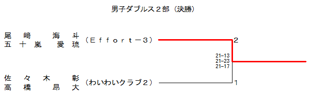 | 塩浦 尚人 神門 生匡 (わいわいクラブ2) | × 11-21 21-13 17-21 | ○ 17-21 21-10 21-16 | ○ 23-25 21-13 21-15 | × 4-21 19-21 | 2 | |