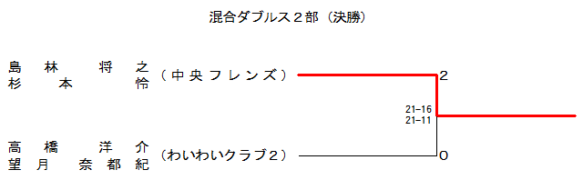 | 高橋 洋介 望月 奈都紀 (わいわいクラブ2) | × 21-16 15-21 14-21 | ○ 21-16 22-20 | ○ 21-19 16-21 21-14 | ○ 21-14 22-20 | 1 |